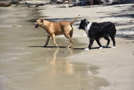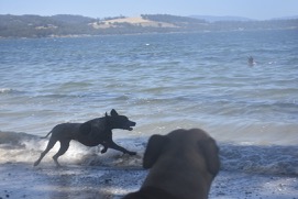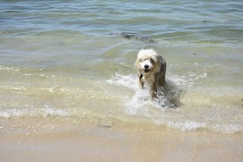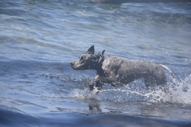 The dog in the water was so funny to watch he must be some kind of water dog. He just ran up and down in the water for so long while we stood watching. He just raced up and down having the time of his life.