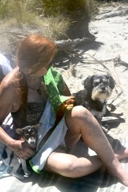 Miss Treacle at 12 lets the youngsters carry on. Preferring to get to know other folk and tell them how abused and neglected she is. Here she just plonked her wet body (I had sat in the water with her on my lap…shoulders as she did not want to be in the water it was very shallow and cooled her down as she was very hot). on this lovely ladies mat. Leaning right against her. Knowing there is a wee 11 week old puppy there. Treacle loves puppies.