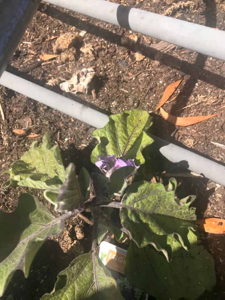 In this bed I have two eggplant/aubergines I have one flower on one plant.